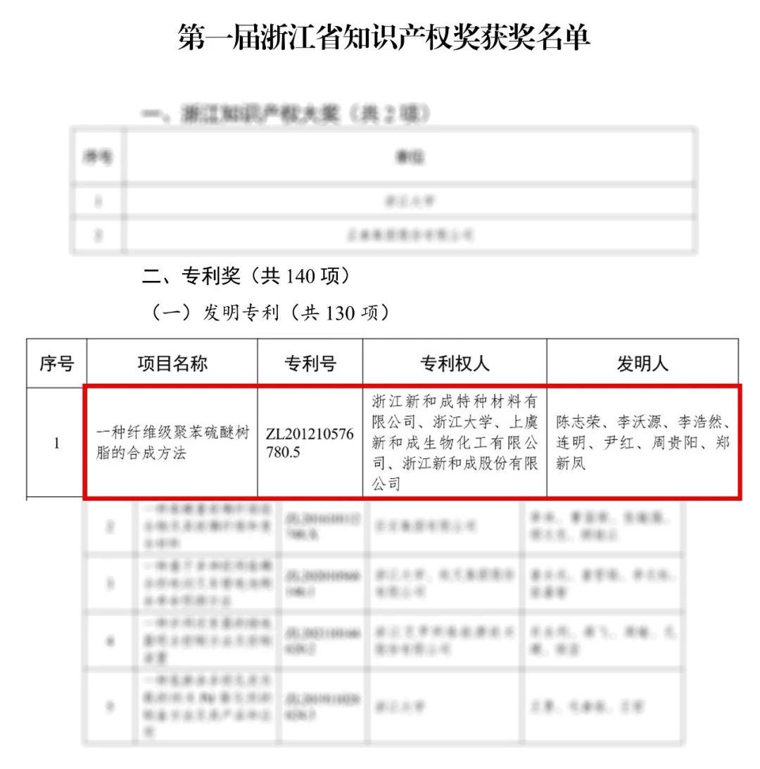 近日,根据《浙江省人民政府关于表彰第一届浙江省知识产权奖获奖者的决定》,第一届浙江省知识产权奖获奖名单公布。浙江新和成特种材料有限公司联合浙江大学、上虞新和成生物化工有限公司、浙江新和成股份有限公司共同申请的发明专利“一种纤维级聚苯硫醚树脂的合成方法”( ZL201210576780.5)荣获专利一等奖。
